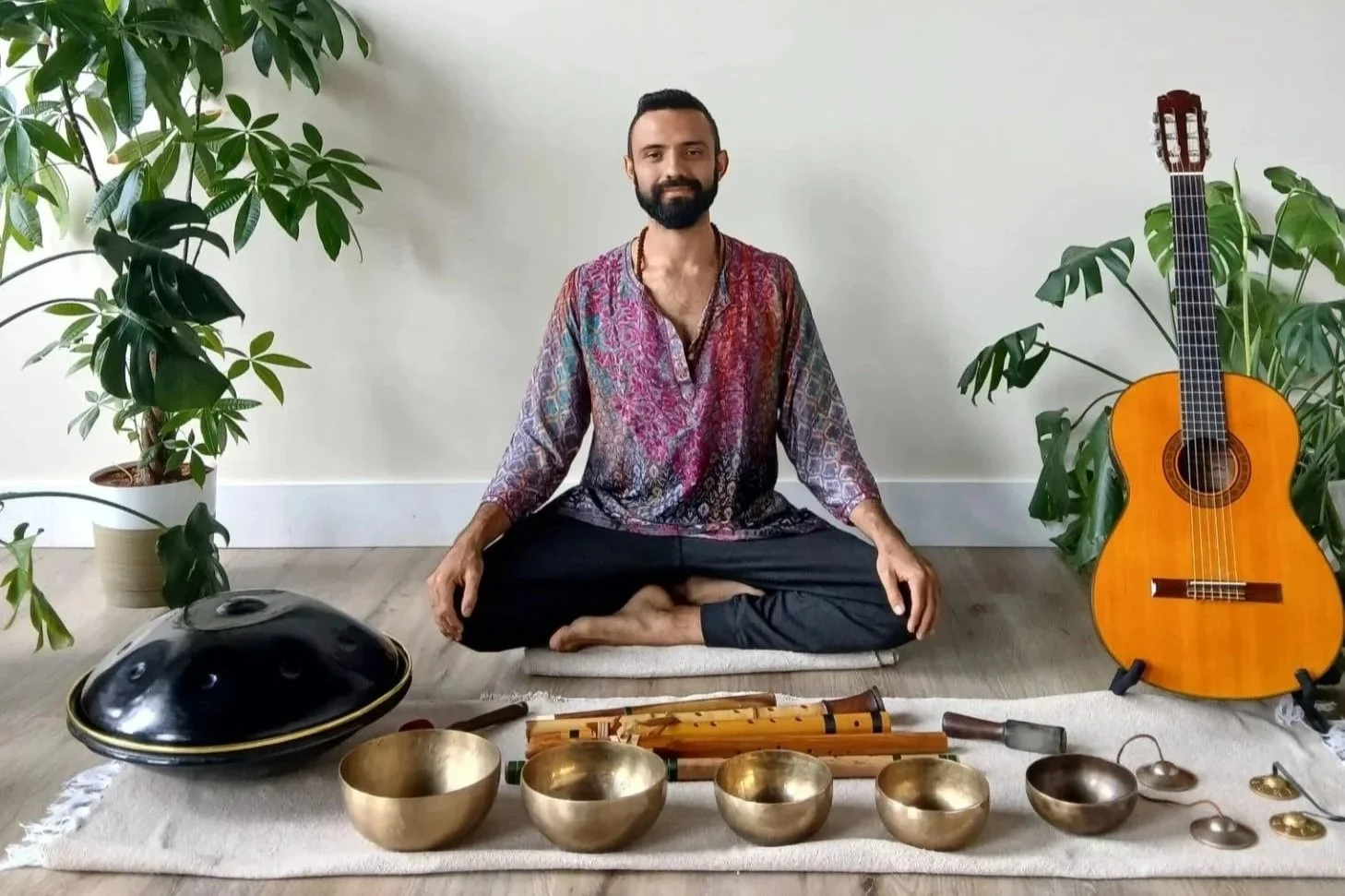 He plays instruments from different cultures such as handpan, Tibetan bowls, ocarina, Native American flutes, didgeridoo, guitar, and more.